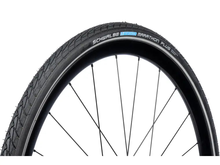 De Schwalbe Marathon Plus is na 10 jaar eens grondig onder handen genomen. De enige echte “onplatbare” band krijgt een dynamisch profiel en overtuigt door sterke eigenschappen. De gepatenteerde 5 mm dikke SmartGuard laag heeft tegenover alle imitatie producten een duidelijk voordeel betreffende de rolweerstand. In de nieuwste versie bouwen we deze voorsprong nog verder uit. De "Anti-Aging“ zijwand verdraagt de typische overbelasting door een te lage bandenspanning beduidend langer dan de concurrentie. Scheurtjes zullen dus niet zomaar ontstaan! De Schwalbe Marathon Plus kan naast stadsfietsen ook gebruik worden voor elektrische fietsen (E-bike ready).